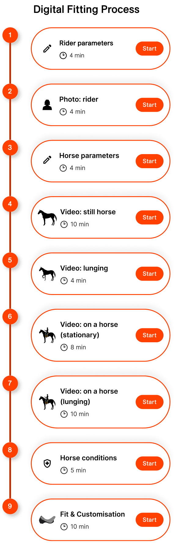 This steps involve capturing rider and horse details through photos and videos. It covers everything from basic measurements to horse movement analysis, ending with a customized fit to ensure optimal comfort and performance. Each step is timed for a smooth and efficient experience.
