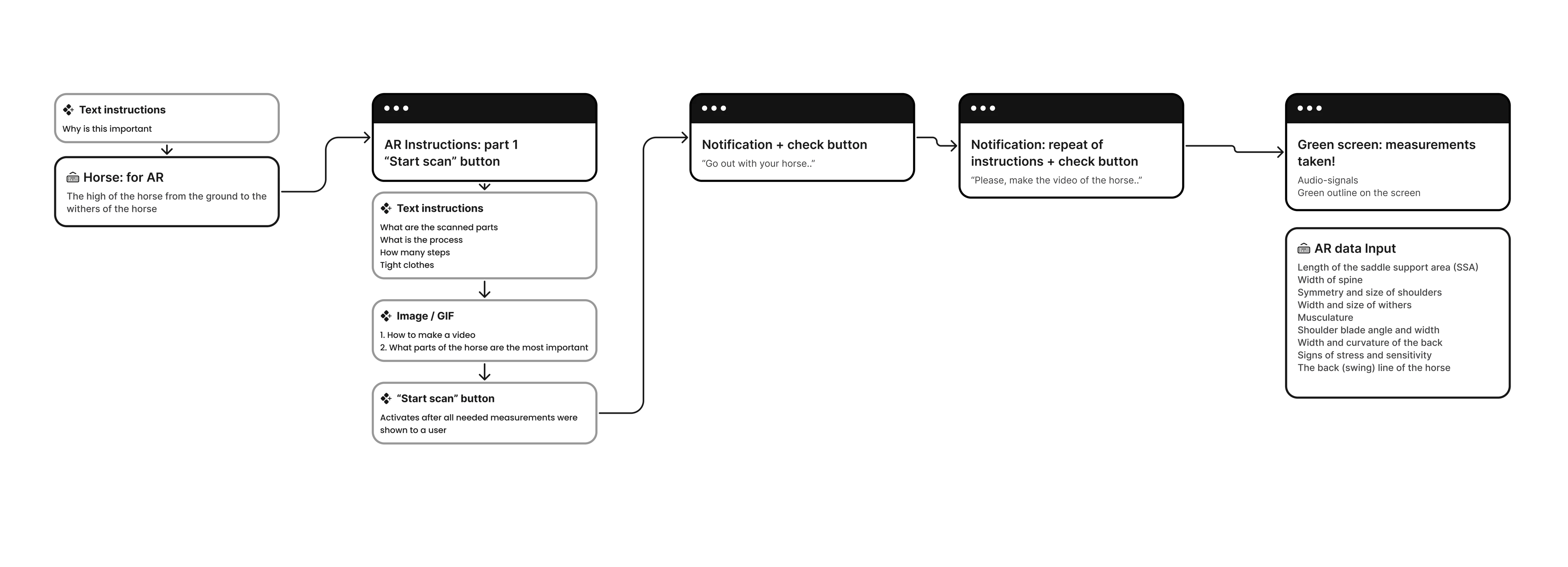 This diagram outlines the step-by-step user flow for collecting AR measurements during the saddle fitting process. It begins with text instructions on why measurements are important, followed by guidance for scanning the horse. The process involves multiple stages of instructions, notifications, and confirmations, ensuring the user correctly captures all necessary data. After measurements are taken, the AR input is analyzed to provide accurate saddle fitting recommendations based on specific horse anatomy data.