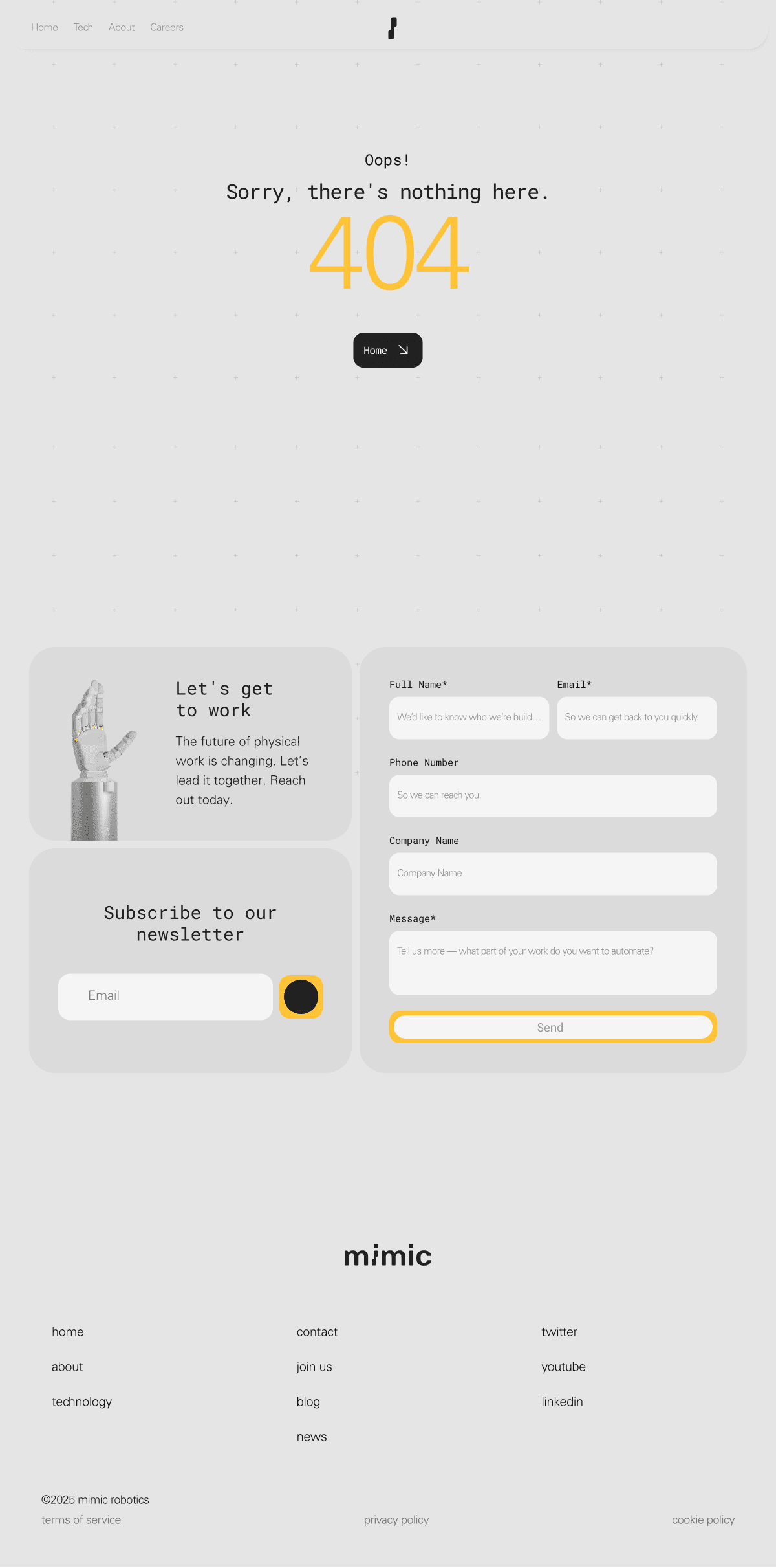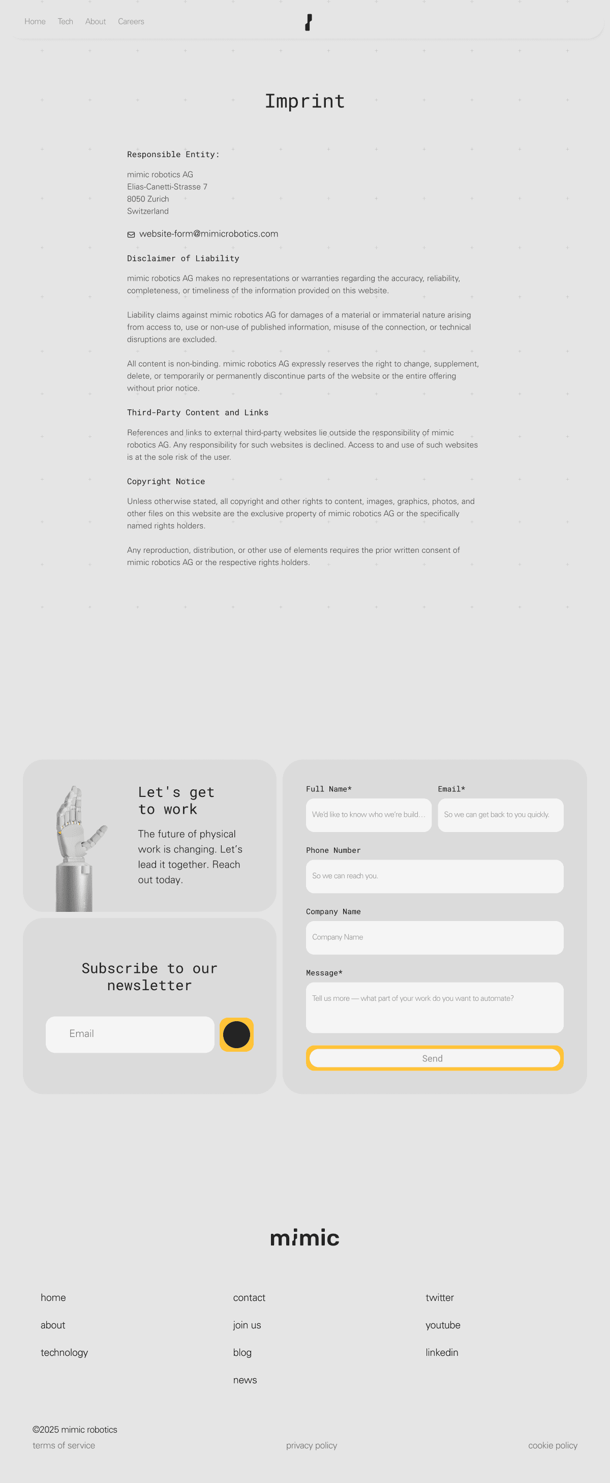 For Mimic Robotics, I was responsible for developing a visual identity and web presence that reflected the company’s cutting-edge robotics technology. My role included UI/UX design, branding, and full website development. I created a modular, future-facing identity system inspired by physical computing and robotic forms. The website was designed to communicate Mimic’s mission clearly to partners, investors, and engineers, combining visual clarity with technical credibility.