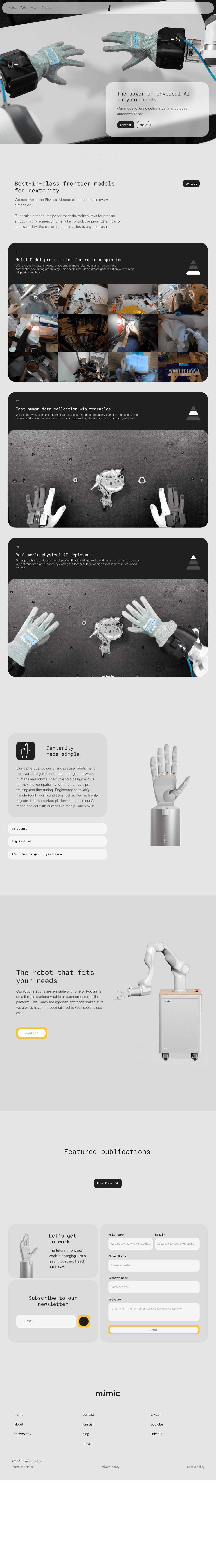 Mimic’s audience includes robotics researchers, deep-tech investors, industrial partners, and future-focused manufacturers. These are stakeholders looking for advanced robotic solutions capable of performing dexterous, flexible tasks in real-world settings. The brand and website needed to inspire confidence, showcase technical innovation, and appeal to collaborators aligned with Mimic’s mission to redefine robotic autonomy in physical environments.